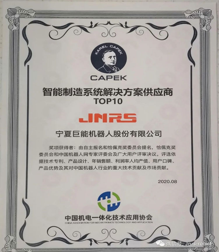 在本屆“恰佩克獎”頒獎盛典上,巨能機(jī)器人榮獲“智能制造系統(tǒng)解決方案供應(yīng)商TOP10”獎項。獎項的獲得,再次證明了巨能機(jī)器人在智能制造系統(tǒng)解決方案的相關(guān)技術(shù)實力。