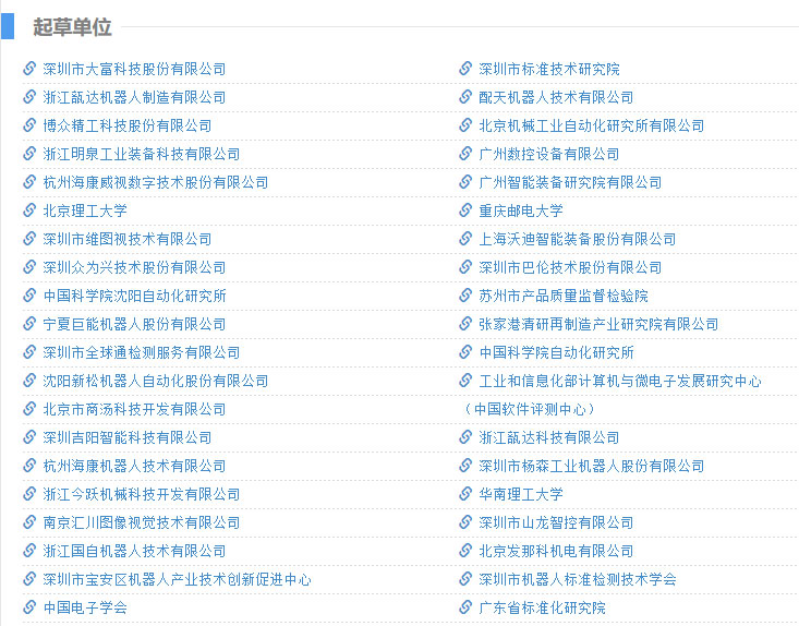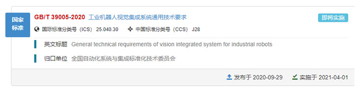 2020年9月29日,由巨能機(jī)器人參與編制的國家標(biāo)準(zhǔn)《工業(yè)機(jī)器人視覺集成系統(tǒng)通用技術(shù)要求》獲批正式發(fā)布,標(biāo)準(zhǔn)編號為GB/T 39005-2020,該標(biāo)準(zhǔn)將于2021年4月1日起正式實(shí)施。