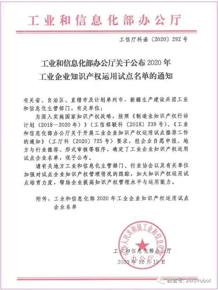 近日,工業(yè)和信息化部公布了2020年度工業(yè)企業(yè)知識產(chǎn)權(quán)運用試點名單,寧夏巨能機器人股份有限公司入選。