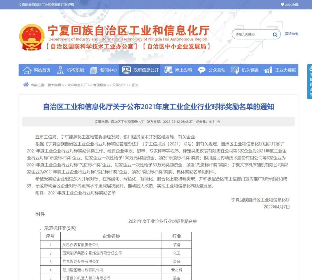 近日,自治區(qū)工業(yè)和信息化廳公布了2021年度工業(yè)企業(yè)行業(yè)對(duì)標(biāo)獎(jiǎng)勵(lì)名單。根據(jù)《寧夏回族自治區(qū)工業(yè)企業(yè)行業(yè)對(duì)標(biāo)獎(jiǎng)勵(lì)管理辦法》(寧工信規(guī)發(fā)〔2021〕12號(hào))的有關(guān)規(guī)定,自治區(qū)工業(yè)和信息化廳組織開展了2021年度工業(yè)企業(yè)行業(yè)對(duì)標(biāo)獎(jiǎng)勵(lì)評(píng)選工作。經(jīng)過企業(yè)申報(bào)、初審、專家評(píng)審等程序,巨能機(jī)器人等5家企業(yè)為2021年度工業(yè)企業(yè)行業(yè)對(duì)標(biāo)“示范標(biāo)桿獎(jiǎng)”企業(yè)并授予獎(jiǎng)牌。