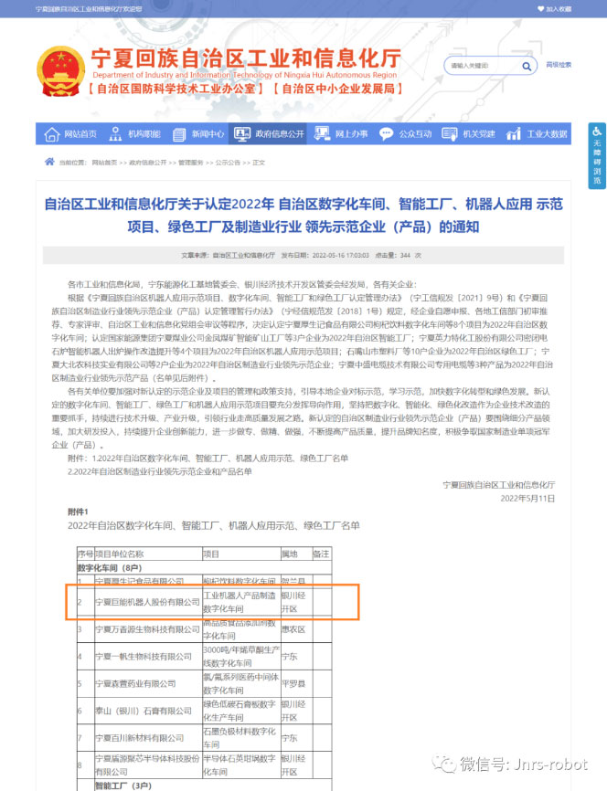 近日,寧夏自治區(qū)工業(yè)和信息化廳公布了2022年自治區(qū)數(shù)字化車間名單,巨能機(jī)器人成功獲評數(shù)字化車間。