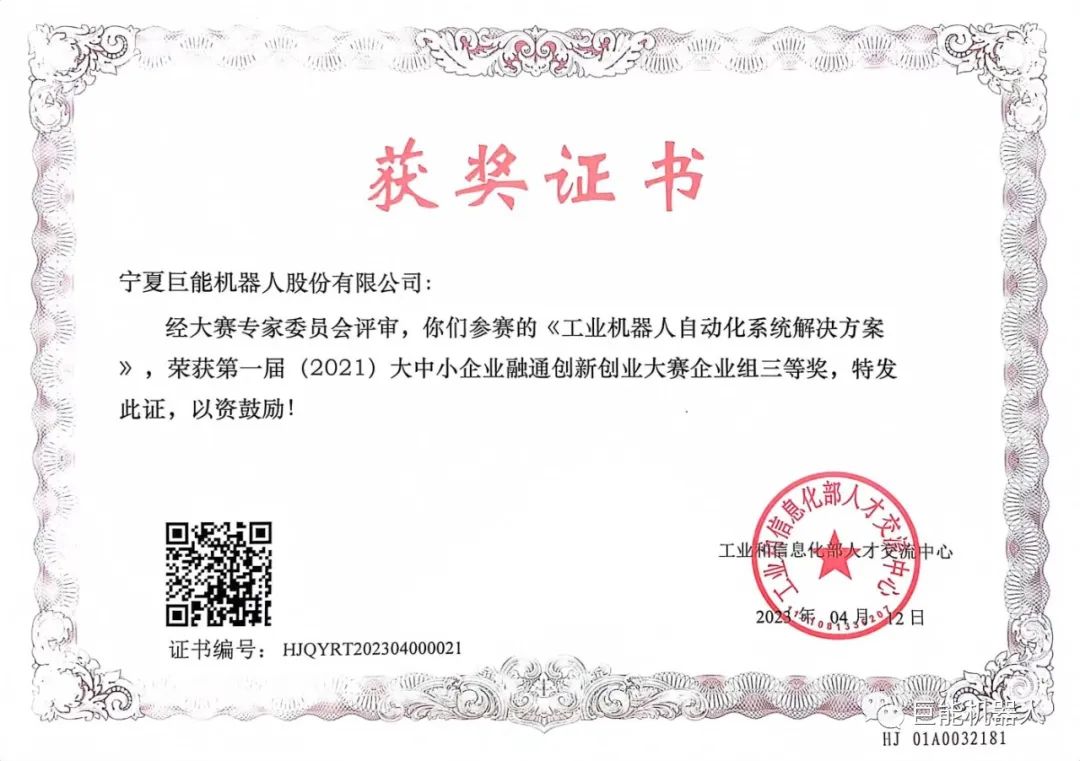 4月12日,由工信部人才交流中心、黑龍江省工信廳主辦的第一屆大中小企業(yè)融通創(chuàng)新創(chuàng)業(yè)大賽決賽暨頒獎儀式在哈爾濱舉行。大賽吸引了來自浙江、天津、重慶、寧夏等全國多地企業(yè)和團隊報名參賽,其中通過審核項目達到260個,最終40個項目入圍總決賽,經(jīng)專家評委現(xiàn)場評選,由巨能股份報送的《工業(yè)機器人自動化系統(tǒng)解決方案》,榮獲企業(yè)組三等獎。
