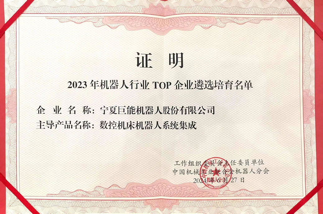 6月27日,中國機械工業(yè)聯(lián)合會機器人分會發(fā)布了2023年機器人行業(yè)TOP企業(yè)遴選培育公示名單,巨能機器人憑“數(shù)控機床機器人系統(tǒng)集成”產(chǎn)品成功入選。